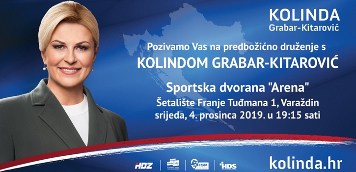03.12.2019. Pozivamo Vas na predbožićno druženje s Kolindom Grabar-Kitarović u sportskoj dvorani Arena, Šetalište Franje Tuđmana 1, Varaždin, u srijedu, 4. prosinca u 19.15 sati! Kopiranje poveznice za dijeljenje vijesti